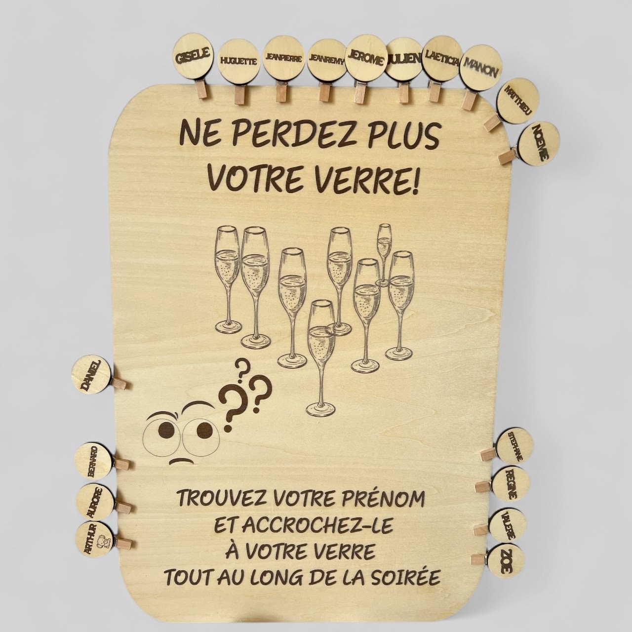 Ce panneau en bois naturel “Ne perdez plus votre verre” est disponible à la location pour vos événements. Pratique et élégant, il permet à vos invités de repérer leur verre tout au long de la soirée grâce aux marque-verres personnalisés (à l'achat).