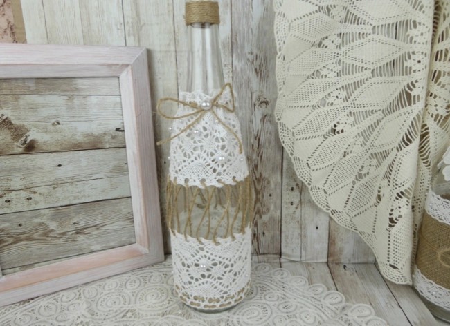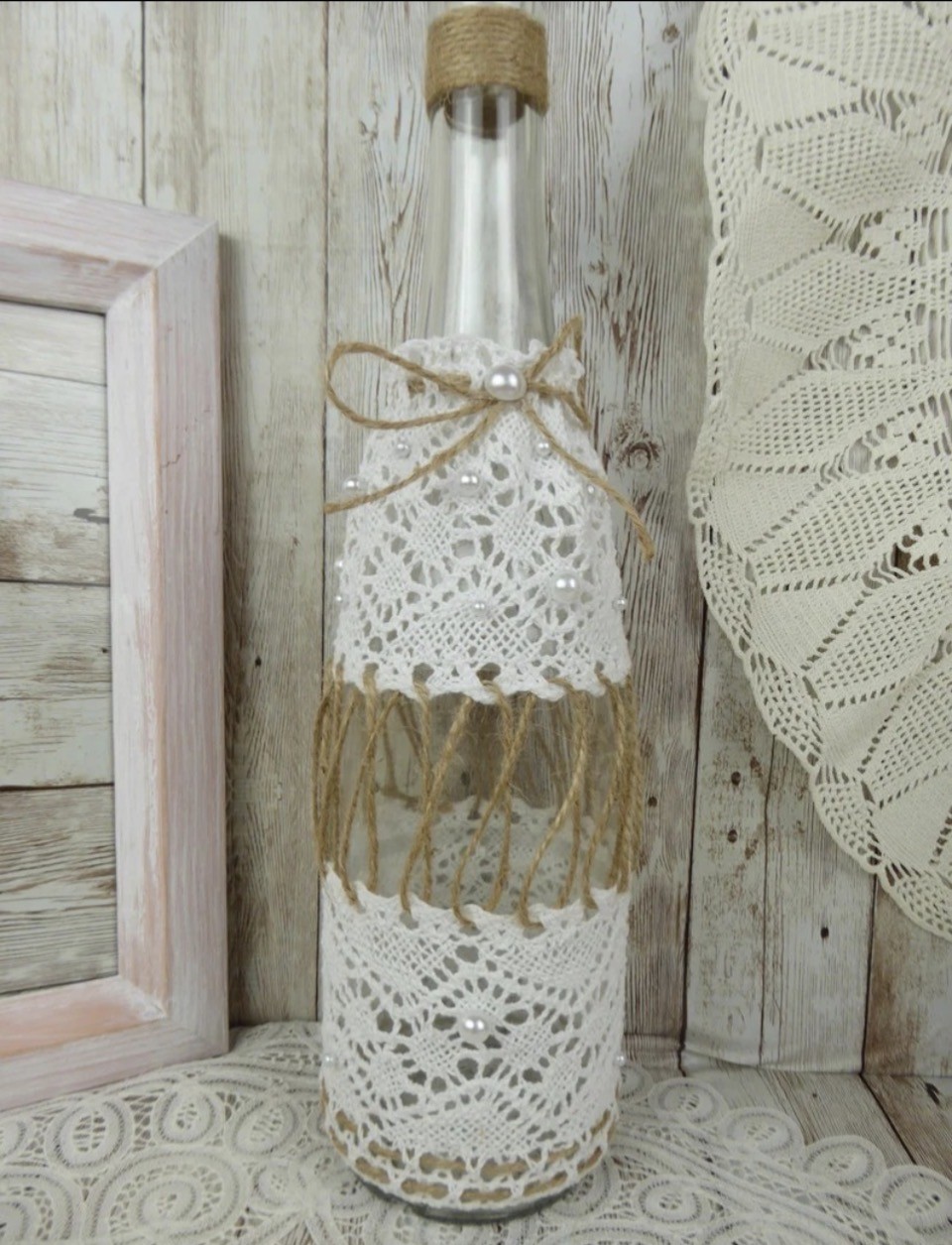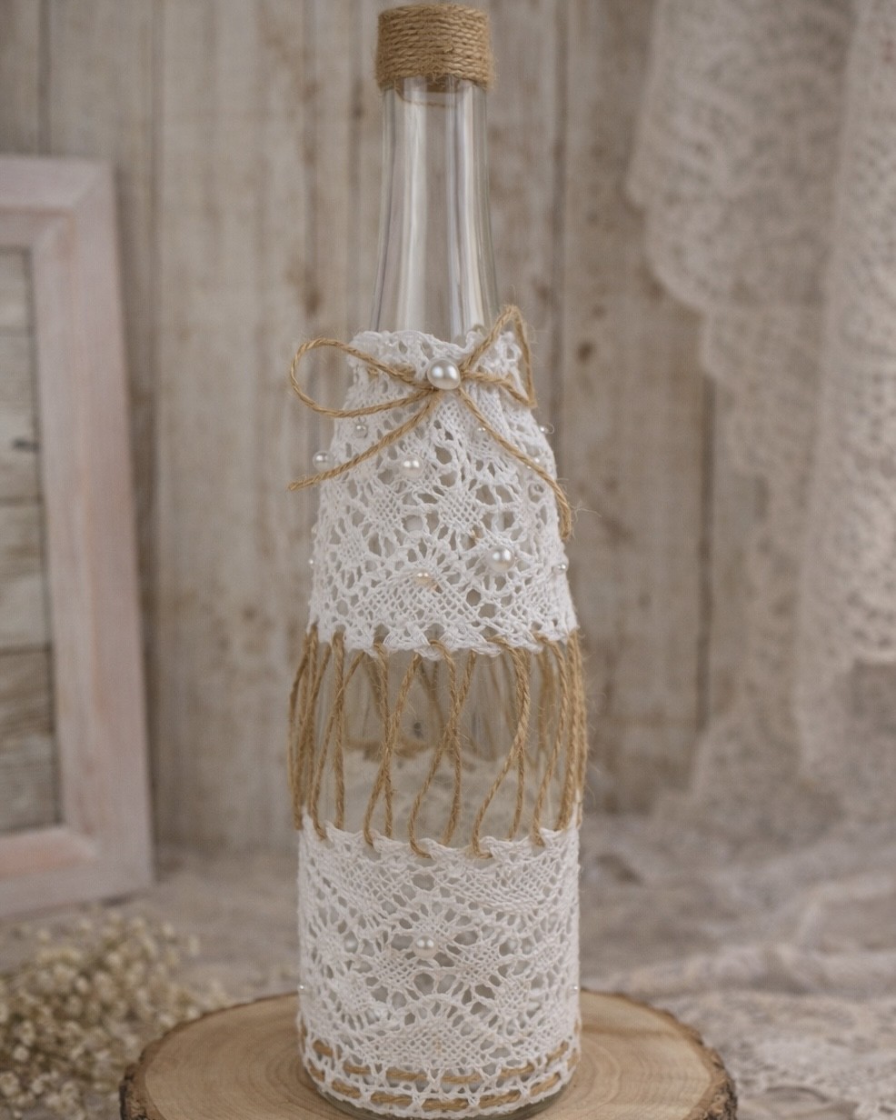 Cette bouteille en verre de 75 cl est disponible à la location pour vos événements : mariages, anniversaires, baptêmes, baby showers, etc. Elle est décorée de dentelle blanche, de perles nacrées et de ficelle de jute, dans un style rustique et romantique.