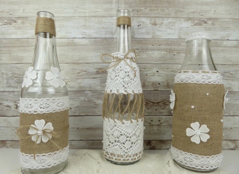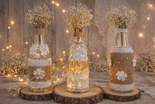 - Matériaux : Verre, dentelle, jute, perles