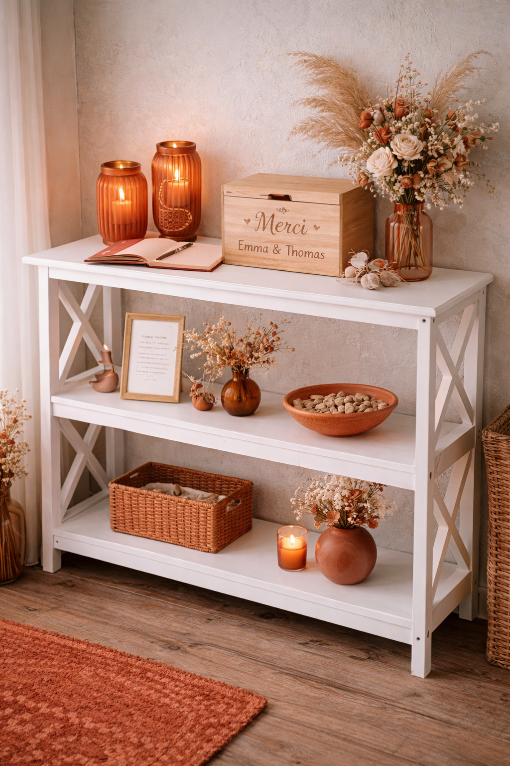 Cette console est disponible à la location dans le cadre de votre décoration de mariage bohème et champêtre à Toulouse.