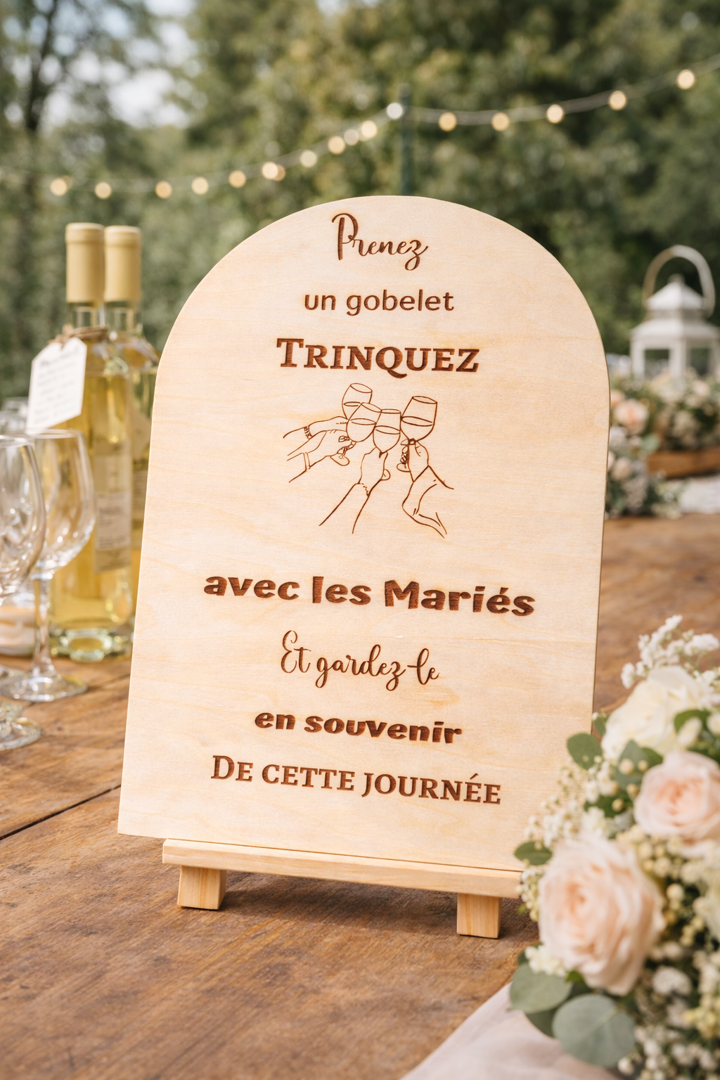 Le message gravé “Trinquez avec les mariés” est un clin d’œil raffiné à la célébration du couple. Son design minimaliste s’accorde avec toutes les décorations de mariage.