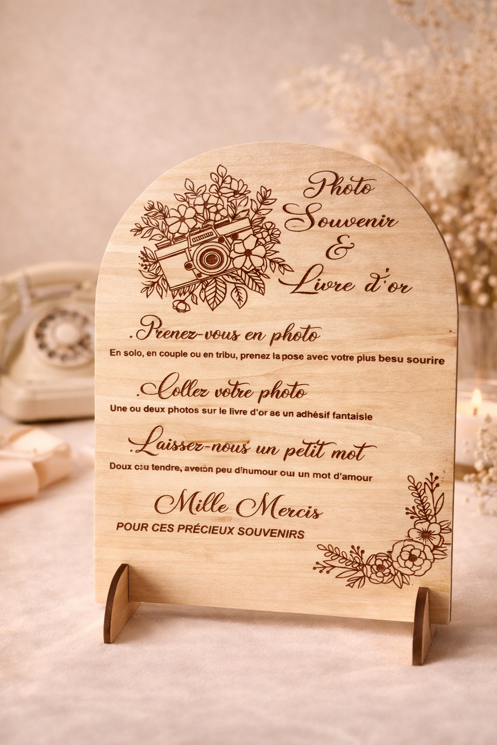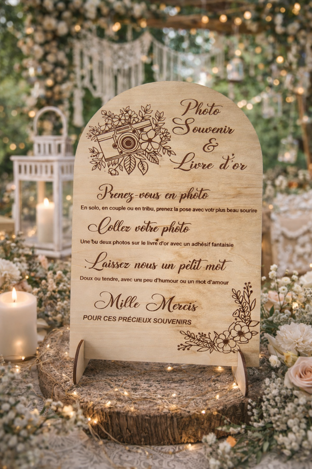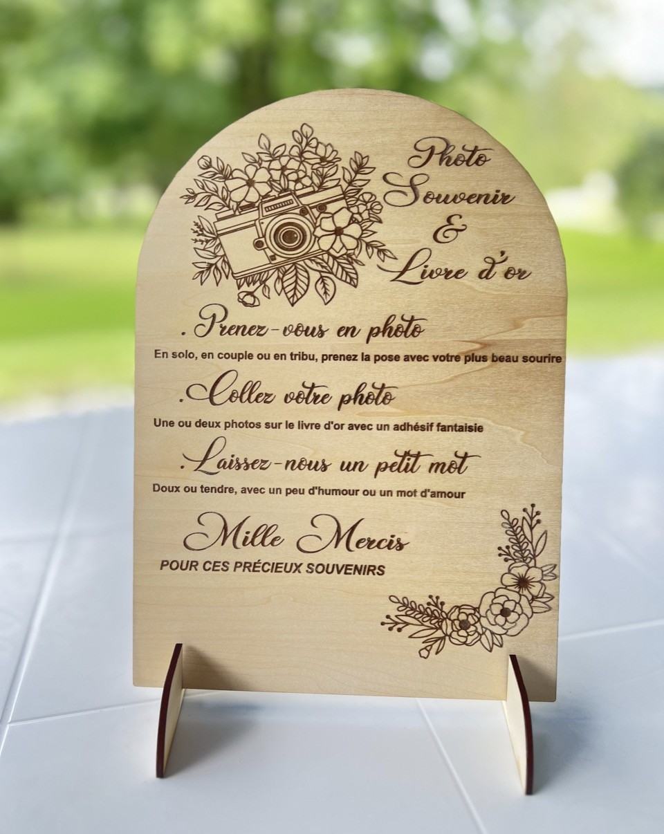 Apportez une touche rustique et raffinée à votre événement avec ce panneau en bois gravé “Livre d’or & Photobooth”. Idéal pour guider vos invités tout en embellissant votre décoration, il s’intègre parfaitement dans un mariage, un anniversaire ou toute réception.