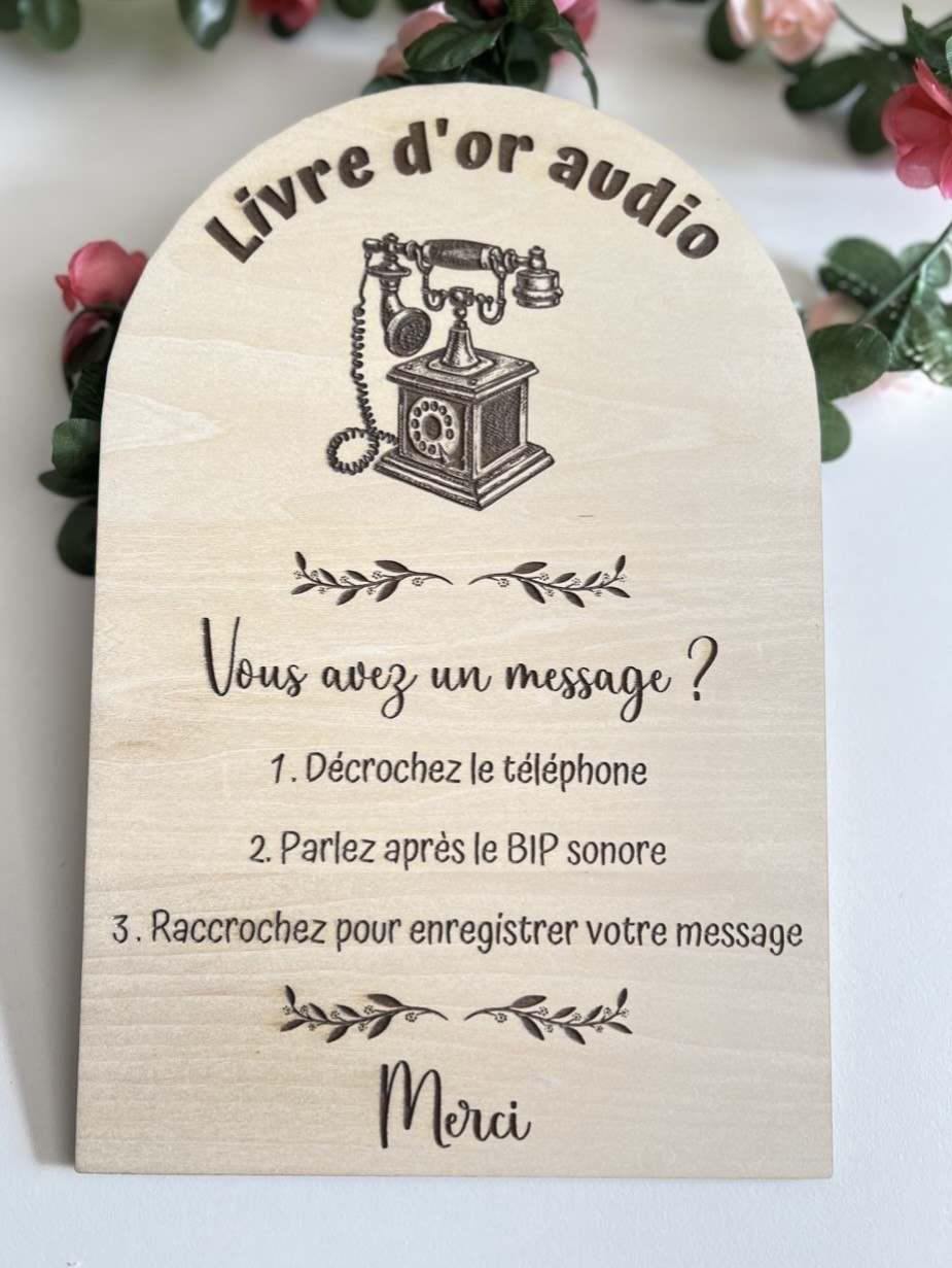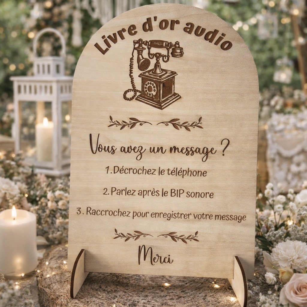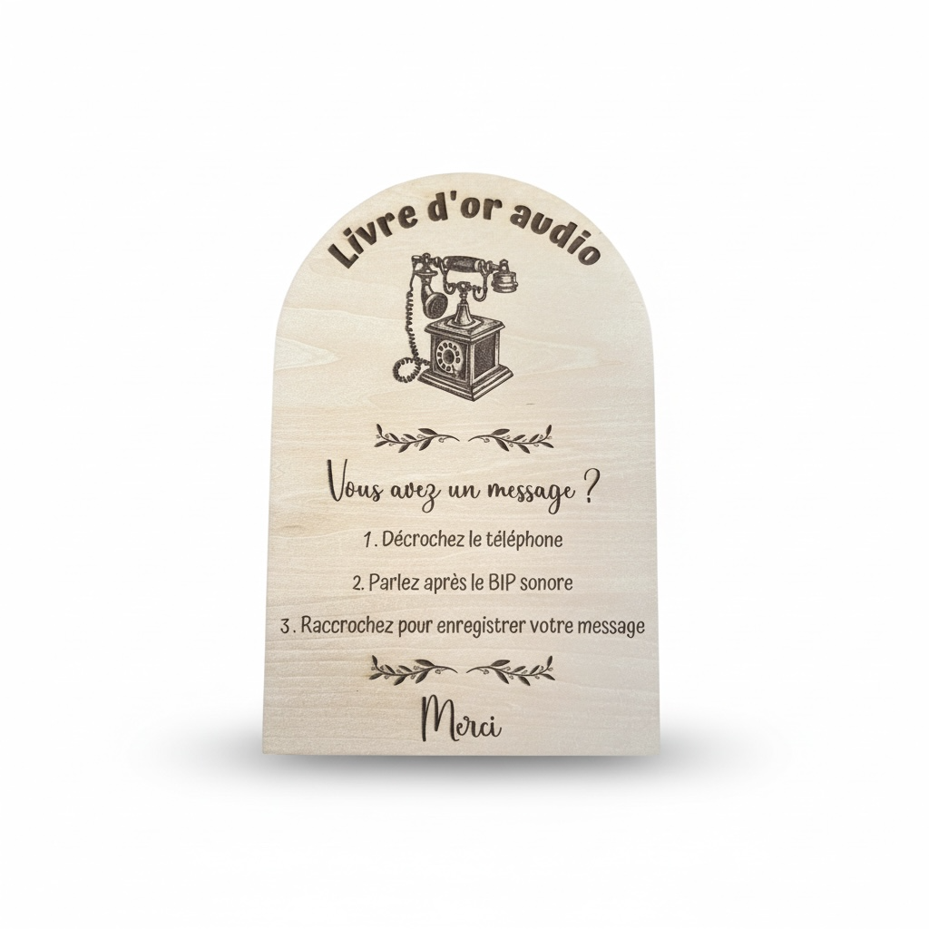 Facilitez l’utilisation de votre livre d’or audio grâce à ce panneau en bois personnalisé, conçu pour guider vos invités en toute simplicité.