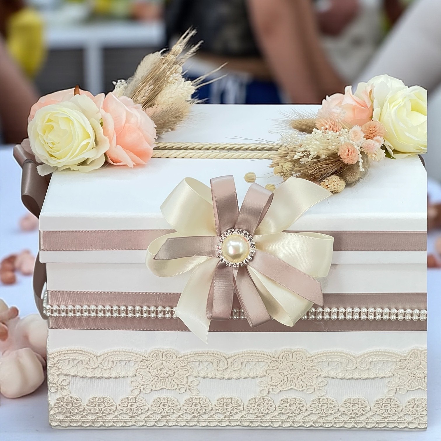 "VÉLINA" est une urne artisanale chic et raffinée, idéale pour sublimer la décoration de votre mariage ou de votre baptême. Entièrement réalisée à la main, cette urne en carton rigide, est peinte en blanc et est ornée de dentelle beige, de rubans satin taupe et crème, de perles beiges, de strass, et d’une élégante composition florale sur le dessus.