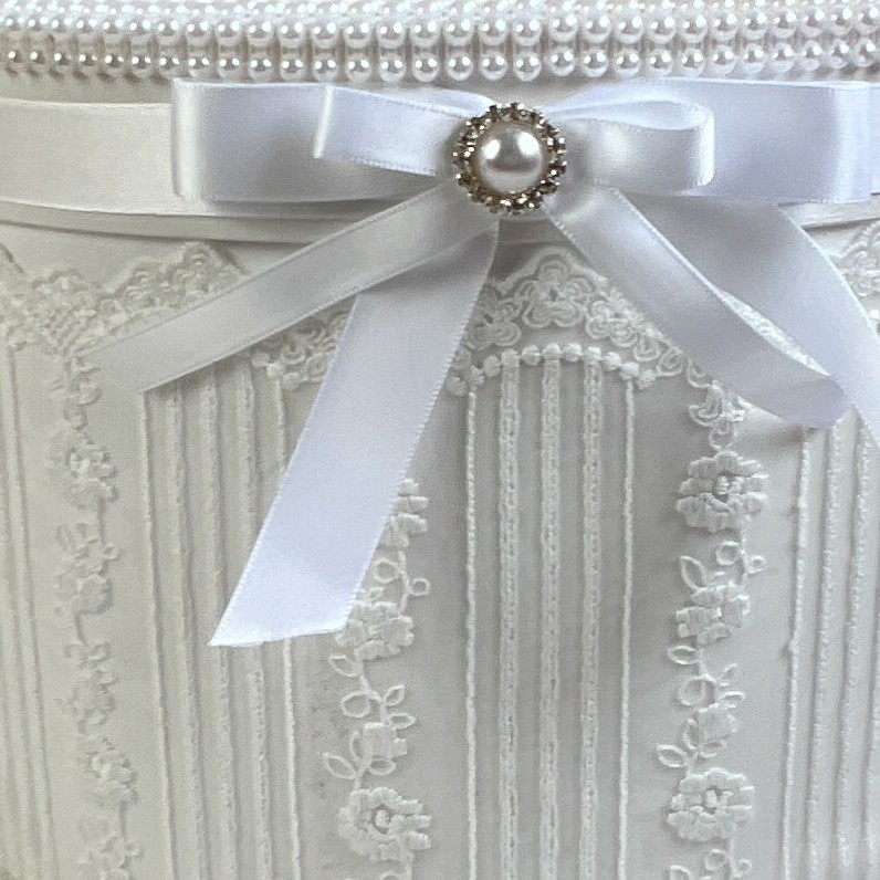 Ornée de dentelle blanche, de perles scintillantes, de rubans en satin et de fleurs en tissu, l’urne Chanelle allie douceur et élégance.